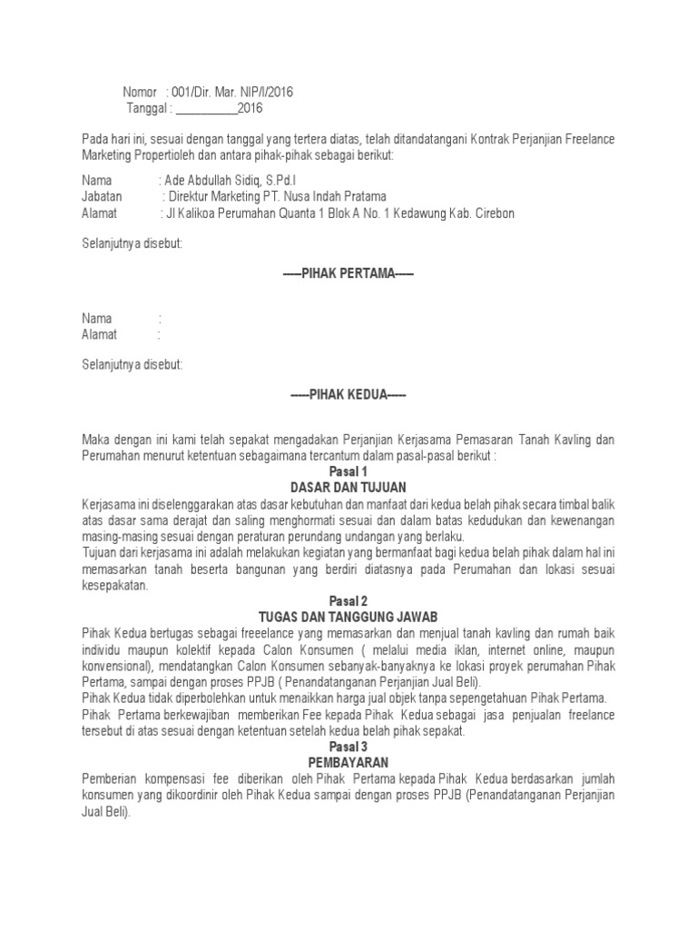 Easy tutorial for you 6. Apa saja yang patut menjadi sorotanmu sebelum memutuskan untuk menandatangani sebuah kontrak kerja freelance? Secure your freelancer career and be more professional. Pekerjaan freelance adalah sebuah pekerjaan yang jangka waktunya tidak tetap, di mana hubungan kerja antara pemilik usaha dengan pekerjanya tidak memiliki kontrak seperti halnya pada pekerjaan. Kontrak kerja freelance biasanya hanya berisi proyek yang akan dikerjakan, biaya dan waktu pengerjaan, contohnya: Pembayaran upah didefinisikan secara jelas dalam perjanjian kontrak. Saat akan menandatangi kontrak kerja atau surat perjanjian kerja, kamu harus memperhatikan di saat penandatanganan kontrak kerja inilah kamu bisa menanyakan beragam hal kepada pihak. Sesuai dengan arti freelance di atas, adapun beberapa syarat menjadi freelancer adalah sebagai berikut Bekerja secara mandiri artinya tergantung dengan kontrak kerja dari perusahaan. Pasal 3 selama kontrak berlangsung pihak pertama dapat memutuskan hubungan kerja. Gratis mendaftar dan menawar pekerjaan. Setelah pekerjaan disudah disempakati selesai maka secara otomatis berakhirlah. Beragam lowongan kerja freelance semarang dapat anda temukan di lokersemar.id.